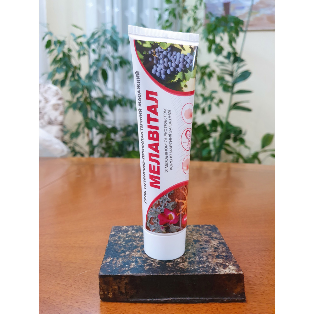 Гель гігієнічно-профілактичний масажний МЕЛАВІТАЛ з меланіном та 2% екстрактом кореня Мартинії запашної має протибольові та протизапальні властивості та сприяє полегшенню стану організму при ревматичних та посправматичних болях, зменшує біль у спині, при розтяжінні м'язів та запаленні суглобів (артрити, артрози), заспокоює та розслаблює тканини тіла.
