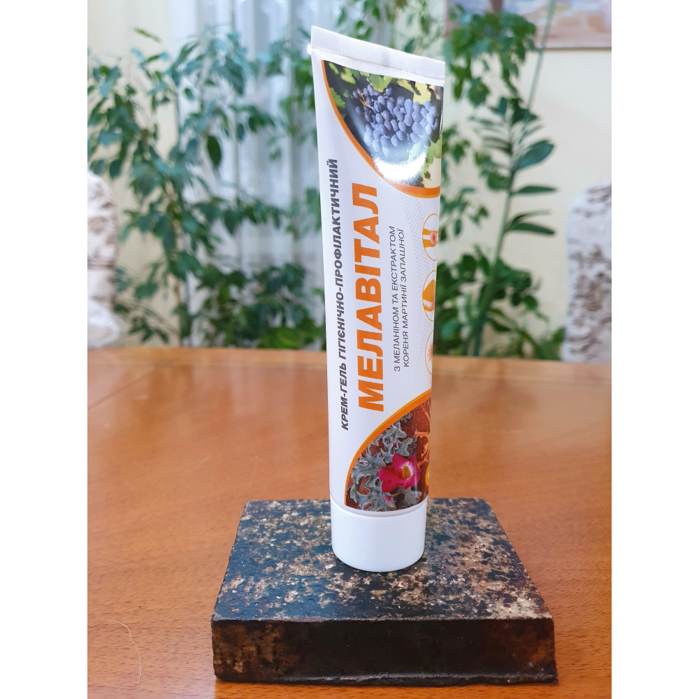 Крем-гель гігієнічно-профілактичний МЕЛАВІТАЛ з меланіном та 4% екстрактом кореня Мартинії запашної має протибольові та протизапальні властивості та сприяє полегшенню стану організму при ревматичних та посттравматичних болях, зменшує біль у спині, при розтяжінні м'язів та запаленні суглобів (артрити, артрози), заспокоює та розслаблює тканини тіла.